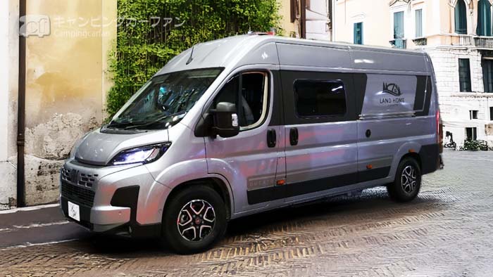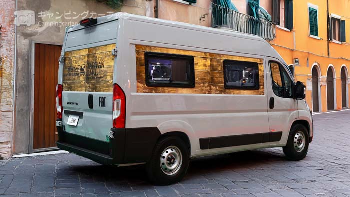 ベース車は正規輸入のフィアットデュカトL2H2。L2H2はシリーズの中でも最も小型のサイズだが、それでも全長5410mm、全幅 2100mmでハイエーススーパーロング(5380x1880mm)よりも大きい。
