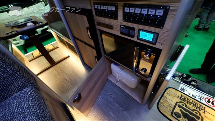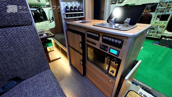 車内に独立した多目的ルームは設けず、その位置には多段の収納を備えた大型クローゼットを配置。空調面では車載用セパレートクーラーとFFヒーターを標準装備し、さらに600Ahの大容量リチウムイオンバッテリーも標準で搭載されている。