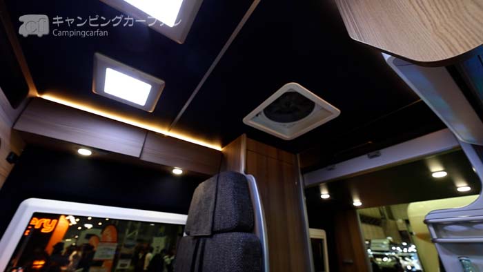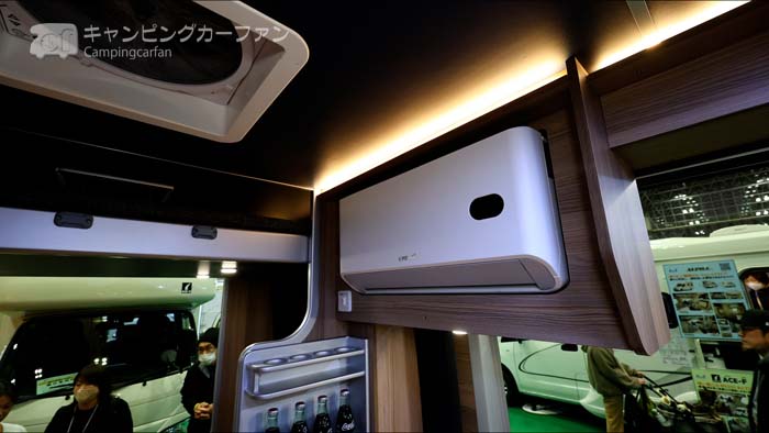 ギャレー上部には車載用セパレートクーラーが標準装備される。冷房能力は相応に備わっていると思われるが、このクラスのモデルであることを踏まえれば、さらなる高効率・高機能を誇る家庭用エアコンの選択肢も欲しくなるところだ。