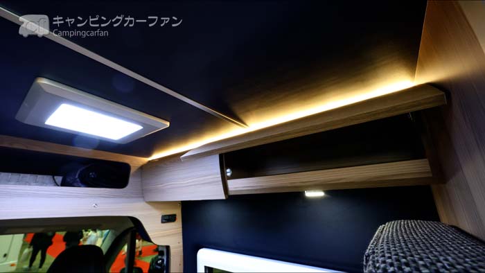 ダイネット右側の上部には、オーバーヘッド収納が設置されている。高さが抑えられているため、特筆すべき収納力があるわけではないが、日用品などを整理しておくには重宝するだろう。また、キャブ上部にも扉のないオープンタイプの収納スペースが確保されており、薄手の寝具などを収めておくのに適している。