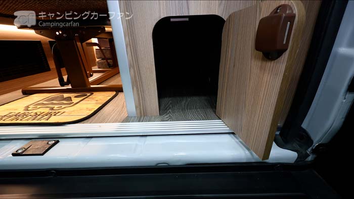展示車には一見すると多目的ルームのような大型の収納(あるいはクローゼット)が備わる。ラップ式やポータブルトイレを置くことはできそうだが、トイレルームとして使用するにはややタイトだ。