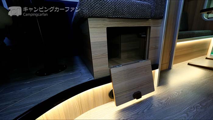 リアの左右シート下も、収納スペースとして確保されている。ただし、左側については電装システムが組み込まれているため、奥行きがやや浅くなっている。また、ベッドモード展開時のベッド下空間もラゲッジスペースとして有効活用できる。