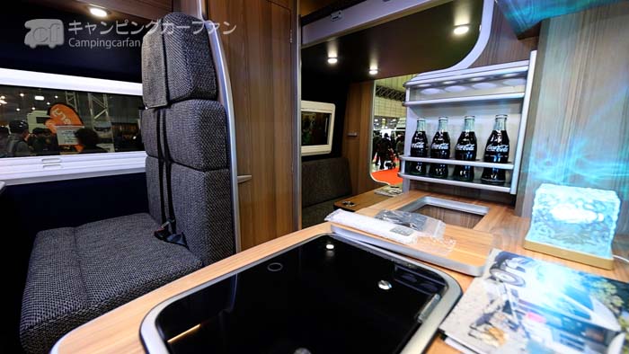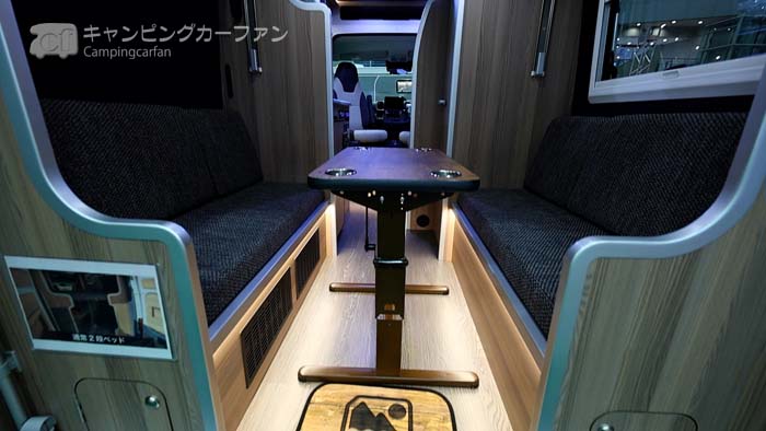 後部のベッドスペースは、横座りの4名対座セカンドダイネットとして機能する。ここには4名分のシートベルトも備わっており、走行中の使用が可能だ。これにより、乗車定員は計8名を確保。大人数での移動にも柔軟に対応できる設計となっている。