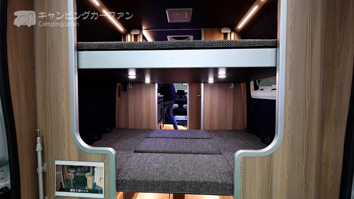 後部には標準で横置きの2段ベッドが装備されている。サイズは上段が1800×1200mm、下段が1860×1200mm。いずれも家庭用セミダブルベッドと同等の幅(1200mm)を確保している。