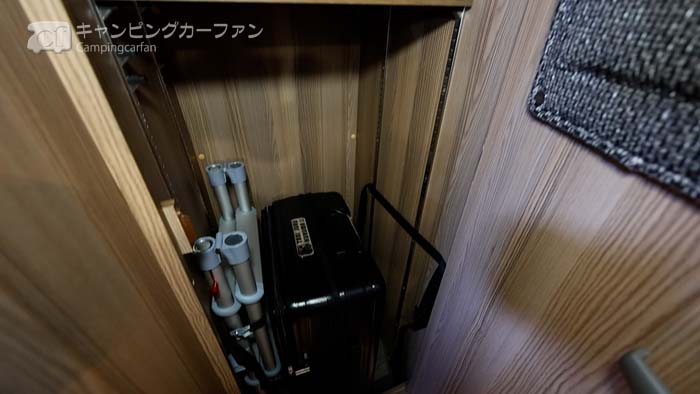 シンク下には、各10Lの給排水タンクが収められている。車外から直接アクセスして出し入れするのは難しい位置だが、エントランスに近く配置されているため、タンクの出し入れ作業自体にそれほど苦労することはないだろう。