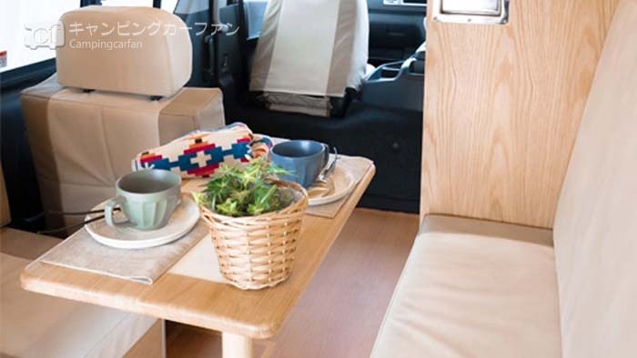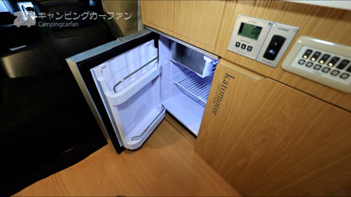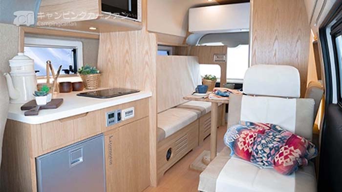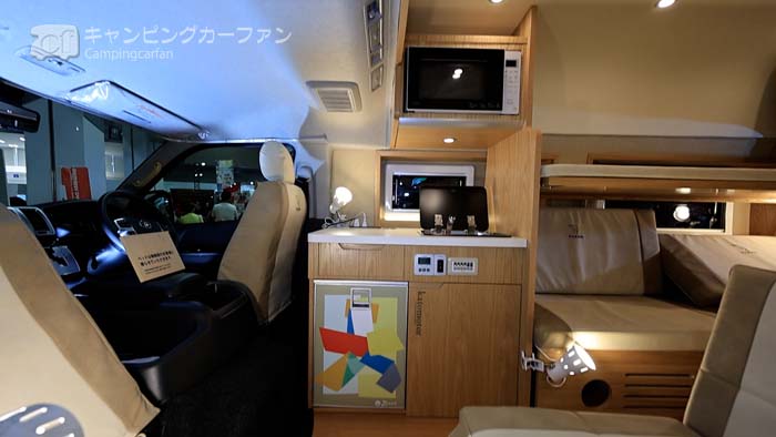横開き式冷蔵庫、電子レンジ、家庭用エアコン(OP)、リチウムイオンバッテリー(OP)を設置でき、長期のクルマ旅にも適している。