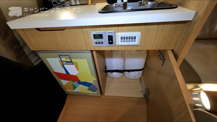 シンクの下には各20Lの給排水タンクが収納されている。車外から直接タンクを出し入れするのは難しいが、エントランスに近いので、出し入れはそれほど苦労しないだろう。