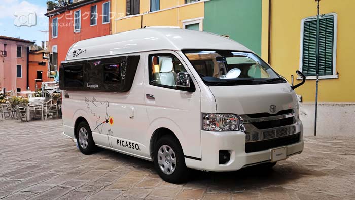 チップトップは、カトーモーターが製作する、ハイエースワイドロングミドルルーフにハイルーフを架装したバンコンキャンピングカー。パブロはチップトップをベースに、同社の70周年を記念してピカソの絵画をモチーフにして製作された記念モデル。