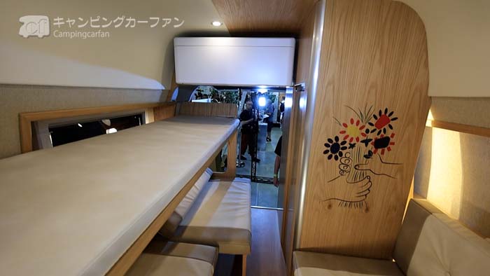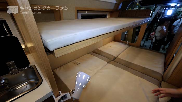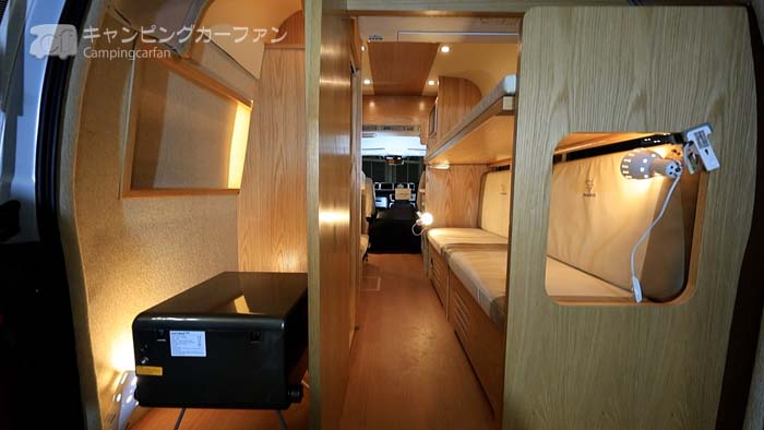 後部の縦置き2段ベッドは下段ベッドをスライドして拡張することにより、計3名が就寝できる。即ち、通常は2名で使用するが、たまにもう1名増えた場合でも3名が前向き乗車でき、無理なく就寝できる。